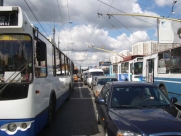Пробка постепенно увеличивается за счет подъезжающих к ней новых троллейбусов, сообщает РИА «Новости».