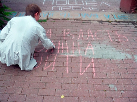 Активисты избрали простой и вместе с тем весьма эффективный способ выразить недовольство действующей властью — они пишут оппозиционные лозунги на асфальте. 30 марта в Екатеринбурге во время антинаркотического концерта «Пацаны, вам это не надо» полиция задержала активистов молодежного крыла партии «Яблоко» Евгения Мезенцева и Анастасию Желтышеву. Молодых людей обвинили в том, что они сделали на памятнике Ленину, рядом с которым проходил концерт, меловую надпись «Эта власть должна уйти».
