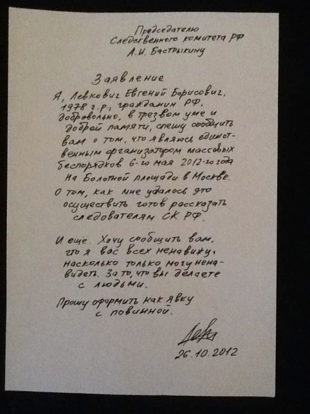 Напомним, в своей явке с повинной журналист российской редакции The Rolling Stone Евгений Левкович сообщает, что он один организовал «массовые беспорядки» на Болотной площади 6 мая. «Добровольно, в трезвом уме и доброй памяти спешу сообщить вам о том, что являюсь единственным организатором массовых беспорядков 6 мая 2012 года на Болотной площади в Москве. О том, как мне это удалось, готов рассказать следователям СК», — написал журналист в своем заявлении на имя председателя Следственного комитета Александра Бастрыкина. «И еще. Хочу сообщить вам, что я вас всех ненавижу, насколько только могу ненавидеть. За то, что вы делаете с людьми», — приписал Левкович в конце. Фото явки было размещено на его странице в «Фейсбуке».