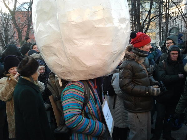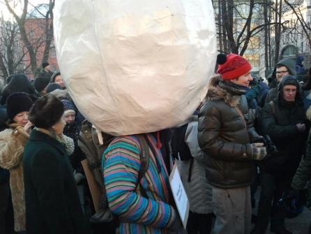 На Лубянке замечен Человек-яйцо, передает корреспондент «Особой буквы». Человек с полутораметровым яйцом на голове и табличкой на груди «Я — человек-яйцо. Я просто гуляю» ходит среди толпы и полицейских. Пока не задерживают.