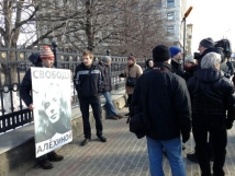 Первый участник акции развернул плакат «Свободу Марии Алехиной!». Через некоторое время его сменил человек с транспарантом «Свободу Pussy Riot».