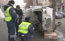 В воскресенье утром в центре Красноярска. лихач на скорости 140 километров в час не справился с управлением Nissan AD и наехал на бордюр. Удар был такой силы, что автомобиль подбросило в воздух: машина задела балкон второго этажа жилого дома, сообщил пресс-центр МВД России.