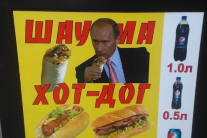 На фотографии президент Российской Федерации Владимир Путин с аппетитом поедает шаурму и привлекает одесситов к ларьку с фаст-фудом. На рекламной стойке также указано, что помимо шаурмы покупателям предлагаются хот-доги и сулугуни.
