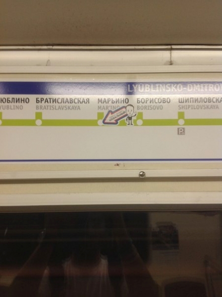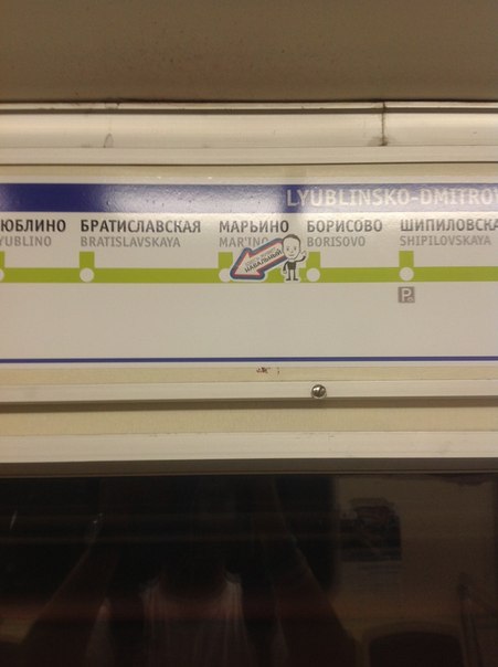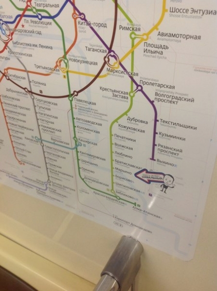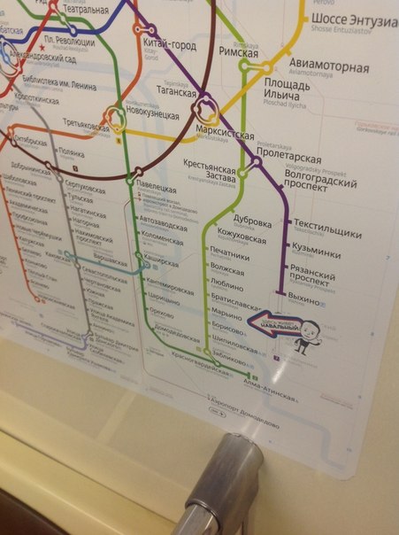 Во вторник на Люблинской ветке московского метро появилось огромное количество стикеров с надписью «здесь живет Навальный» и стилизованным изображением кандидата в мэры. Стикеры со стрелкой размещались на картах метро и указывали на станцию Марьино. Стикеры появились в каждом вагоне каждого поезда «салатовой ветки», на каждой наклеенной в вагонах схеме метрополитена.