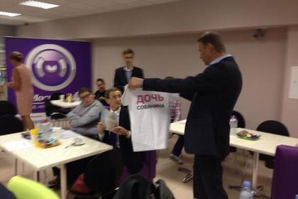 Кандидат в мэры Москвы Алексей Навальный презентовал своему сопернику по выборам кандидату от «Справедливой России» Николаю Левичеву футболку с надписью «Дочь Собянина».