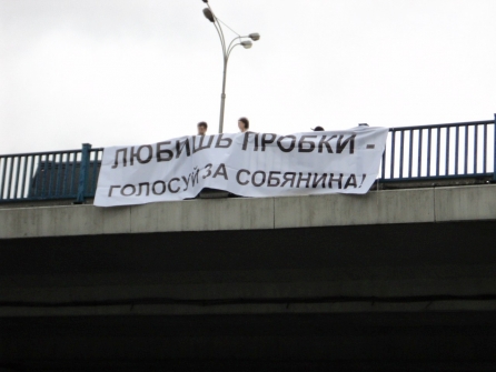 «На восьми шоссе при въезде в город появились баннеры «Любишь пробки — голосуй за Собянина». «Братья» напомнили про очередное невыполненное обещание «Единой России» — решить транспортные проблемы Москвы. Баннеры были вывешены на Ленинградском, Дмитровском, Ярославском, Горьковском, Новорязанском, Боровском, Калужском и Новорижском шоссе», — сообщают активисты.