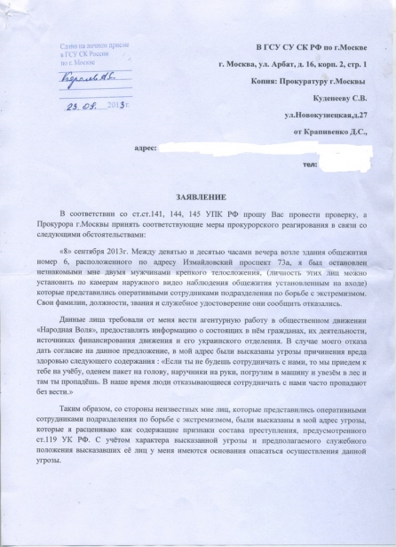 Активист левонационалистической организации «Народная воля» Данила Крапивенко обратился в Следственный комитет с заявлением, в котором сообщает о попытке сотрудников Управления по противодействию экстремизму завербовать его. По словам активиста, в случае отказа оперативники угрожали ему физической расправой.
