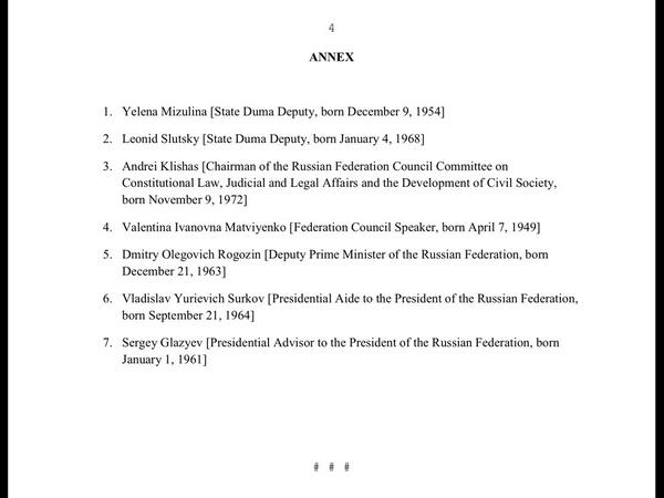 Среди россиян, против которых введены санкции США, также депутаты Госдумы Елена Мизулина, Леонид Слуцкий, член Совета Федерации Андрей Клишас.