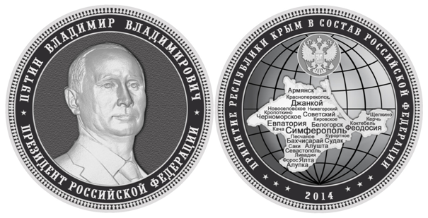 В честь присоединения Крыма к России мастерская художественного оружия «Арт-Грани» уже приступила к выпуску серии памятных монет весом 1 килограмм и размером с ладонь. Об этом сообщает РИА «Новости». Коллекция «Крым-2014» будет состоять из 25 серебряных и позолоченных монет. На аверсе монет будет изображен Владимир Путин, а на реверсе — карта Крымского полуострова.