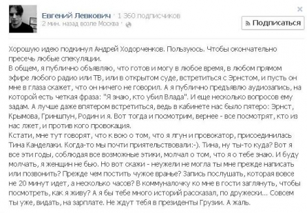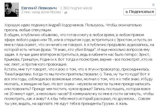 2008 год: Левкович берет интервью у Эрнста, но тот не дает согласия на публикацию. 2013 год: Левкович публикует интервью, утверждая, что не под диктофон Эрнст назвал Лисовского заказчиком убийства Листьева. Рунет кипит, а мы следим за его кипением.