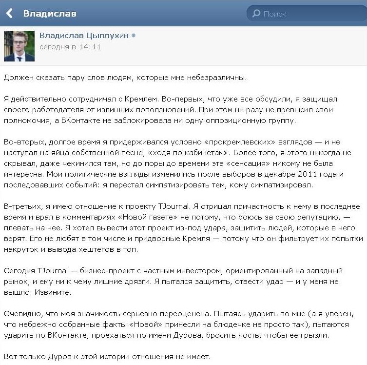 О проекте TJournal, за которым внимательно следили и во «ВКонтакте», и в администрации президента, Цыплухин пишет, что акционер «ВКонтакте» Лев Левиев связывался с ним для обсуждения инвестиций в проект. Он говорит, что «в состав акционеров можно ввести какое-нибудь доверенное лицо из АП», и отмечает: «Без вас решений принимать никаких не буду». Автор писем приводит смету расходов на TJournal и «Новости из будущего», куда входят как затраты на рекламу, так и зарплаты редакторов и разработчиков.